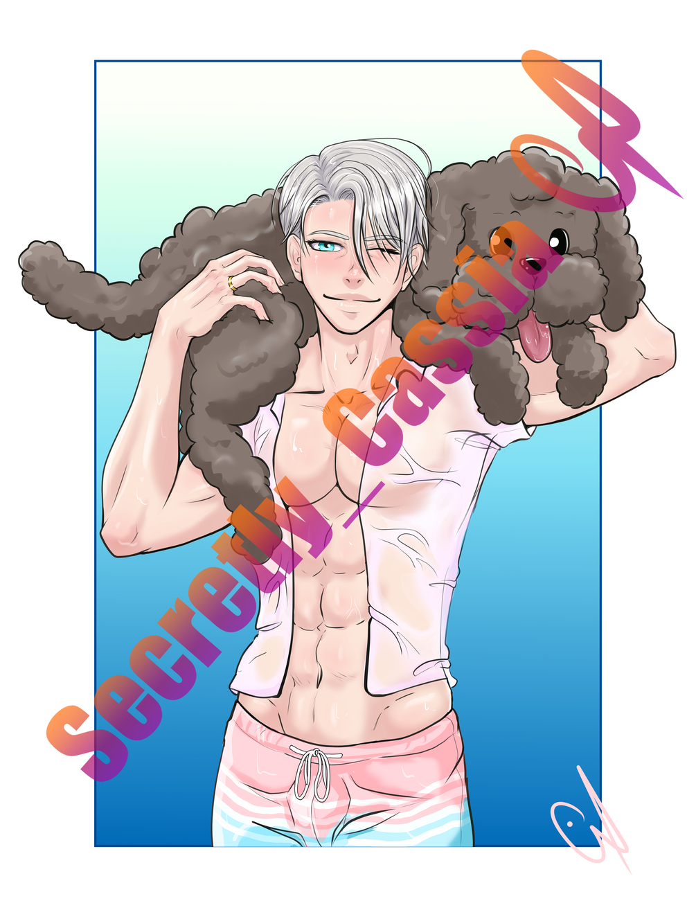 Victor fanart from Yuri on Ice. This is Victor at the beach with his dog Makkachin!!!
